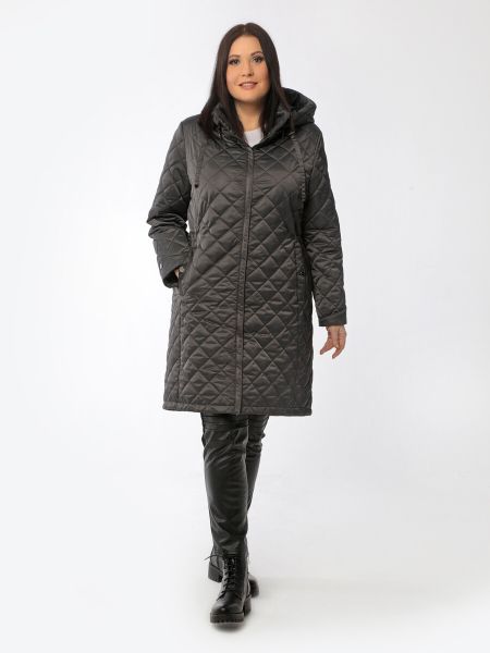 Укороченное демисезонное пальто прямого силуэта с втачными рукавами и застежкой на двухзамковую молнию. Воротник — стойка, переходящая в капюшон. Прорезные карманы застегиваются на кнопку; есть потайной карман на молнии. Прилегание в области талии можно обеспечить с помощью кулиски. Изделие выполнено из актуальной стежки и имеет разноуровневую длину. Подкладка — в мелкую полоску.