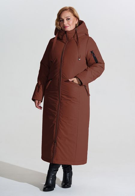 Длинное зимнее пальто приталенного силуэта с центральной застежкой на металлическую, двух замковую молнию. Внутри ветрозащитный клапан. Модель садится на любую фигуру, скрывая ее недостатки и подчеркивая стройность. Плащевая ткань с мембраной , очень стойкая к осадкам и загрязнениям, отталкивает воду и защищает от ветра, пропускает через себя водяной пар. Благодаря качественному утеплителю "ТермМакс" в пальто будет комфортно как поздней осенью, так и зимой. Подкладочная ткань с принтом. Карманы с молниями, капюшон не отстегивается, затягивается на кулиску. Внутренние трикотажные манжеты дополнительно защищают от холода. Есть большие размеры.