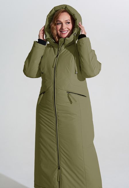 Длинное зимнее пальто приталенного силуэта с центральной застежкой на металлическую, двух замковую молнию. Внутри ветрозащитный клапан. Модель садится на любую фигуру, скрывая ее недостатки и подчеркивая стройность. Плащевая ткань с мембраной , очень стойкая к осадкам и загрязнениям, отталкивает воду и защищает от ветра, пропускает через себя водяной пар. Благодаря качественному утеплителю "ТермМакс" в пальто будет комфортно как поздней осенью, так и зимой. Подкладочная ткань с принтом. Карманы с молниями, капюшон не отстегивается, затягивается на кулиску. Внутренние трикотажные манжеты дополнительно защищают от холода. Есть большие размеры.