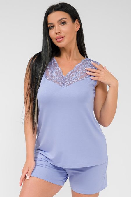 Модель состоит из топа и шорт. Топ полуприлегающего силуэта, плавно расширяется к низу, что позволят подчеркнуть изящность линий фигуры. Верх топа украшен широким мягким кружевом, делая акцент на линии декольте. Шорты со средней высотой посадки на резинке. Пижама подарит чувство легкости и комфорта во время сна и отдыха.