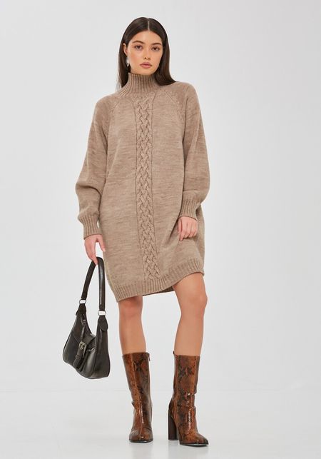 Вязаное платье О-образного силуэта со свитерным воротником длиной выше колена (при росте от 164 до 170 см). Рукав покроя реглан, широкий, с собирающей по низу манжетой. Воротник цельновывязанный, необходимо обдать паром и немного растянуть, затем дать остыть в таком положении, если будет немного не комфортно.