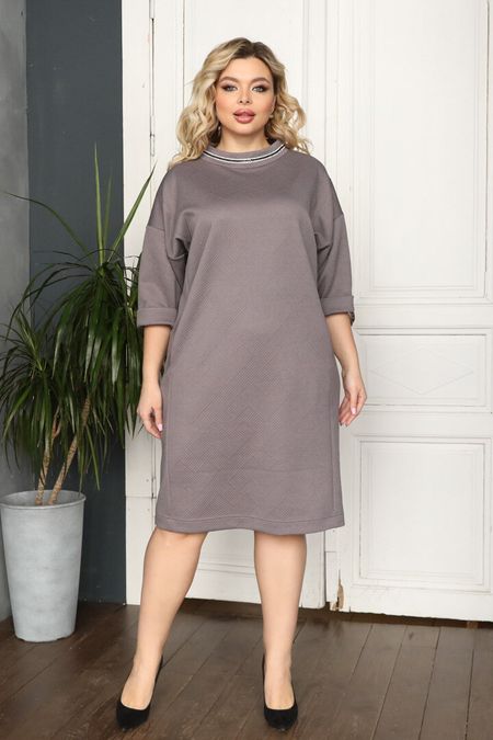 Эффектное платье прямого силуэта из трикотажного полотна серого цвета. Воротник полустойка дополнен декоративным элементом. Платье со спущенной проймой и вачными рукавами. По бокам изделия — внутренние карманы. По спинке изделия — разрез. Длина изделия по спинке от плечевого шва до низа изделия — 108 см. Рост модели 170 см.