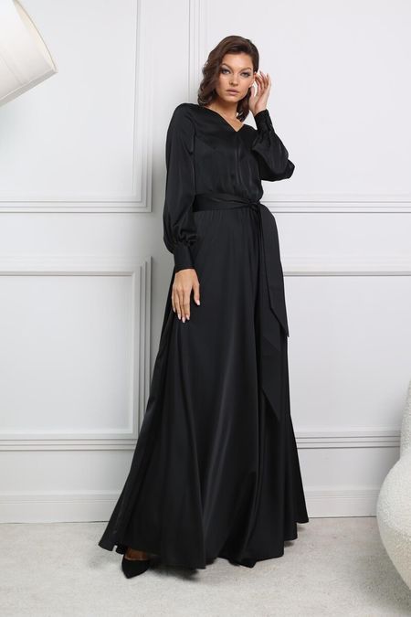 Платье макси с V-образным вырезом по переду и спинке, отрезное по линии талии с втачной резинкой и декоративным поясом. Втачной рукав с манжетами, застегивающимися на 2 пуговицы.<br> <br> Ткань: искусственный шелк.<br> <br> Обмеры готовых изделий.<br> <br> Длина изделия: 159 см (42р), 159,5 см (44р), 160 см (46р), 160,5 см (48р), 161 см (50р), 161,5 см (52р).<br> <br> Обмер изделия по груди: 89 см (42р), 93 см (44р), 97 см (46р), 101 см (48р), 105 см (50р), 109 см (52р).<br> Обмер изделия по талии: 90 см (42р), 94 см (44р), 98 см (46р), 102 см (48р), 104 см (50р), 108 см (52р).<br> Обмер изделия по бедрам: 145 см (42р), 149 см (44р), 153 см (46р), 157 см (48р), 161 см (50р), 165 см (52р).<br> <br> Длина рукава: 64 см (42р), 64,3 см (44р), 64,6 см (46р), 64,9 см (48р), 65,2 см (50р), 65,5 см (52р) <br> <br> Параметры модели: 175 см, грудь 86 см, талия 64 см, бедра 94 см.<br> На модели размер 42.<br> <br> Сделано в России.