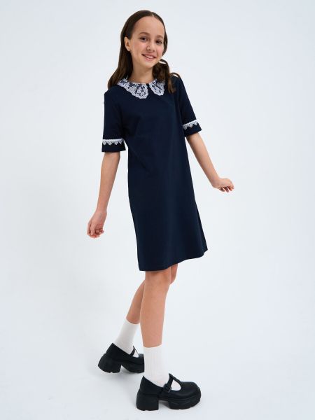 Главная » Одежда Платье Просмотров 8 Платье трикотажное А-образного силуэта с втачными короткими рукавами. Горловина круглая и оформлена отложным ажурным воротником, застежка вырез по центру спинки, низ рукавов декорирован ажурной тесьмой.<br> Состав: 92% хлопок; 8% лайкра Nota Bene