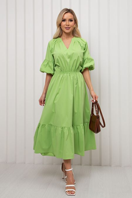 Стильное легкое платье приталенного силуэта. Короткий рукав реглан по низу оформлен притачной манжетой — фонарик. Горловина на сборке, оформлена стойкой. Модель отрезная на линии талии, присборена на эластичную резинку. Низ юбки оформлен притачным воланом. <br> Рекомендуемая стирка при t не более 30°.<br> Длина изделия: 124 см<br> Длина рукава от горловины: 39 см<br> Рост фотомодели: 168 см <br> Размер фотомодели: 42<br> Ткань: Хлопок