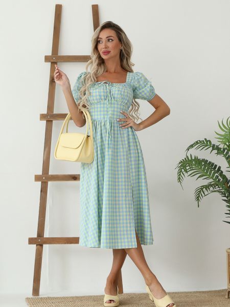 Обаятельное платье прилегающего силуэта из текстильной ткани голубо-желтого цвета. Фигурный вырез обработан внутренней обтачкой, дополнен декоративным швом с резинкой и завязками. Втачные рукава обработаны резинкой. Линия талии эффектно подчеркнута втачным поясом. Верхняя часть спинки дополнена декоративными швами с резинкой. Длина изделия по спинке от плечевого шва до низа изделия — см. Рост фотомодели — 170 см.