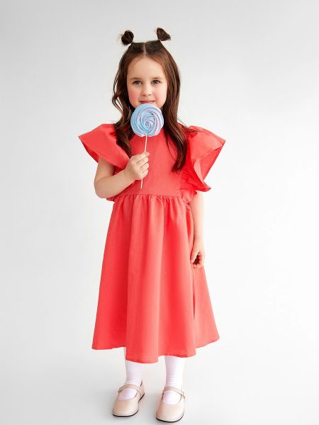 Платье для девочек с декоративными рукавами, горловиной круглой формы, длиной до колена. В составе высококачественный хлопок и лен. По спинке застежка на пуговицу. В рельефе декоративные рюши. Юбка расширенная со сборкой по талии. Ткань мягкая, легкая и эластичная, не сковывает движения, комфортная в носке, в ней абсолютно не жарко. Сохраняет свой насыщенный цвет и качество даже после многократных стирок. Обладает хорошей устойчивостью к выцветанию и отлично держит форму. Отличный выбор от Mark Formelle для вашей малышки!