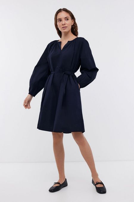 Платье миди — стильная и практичная вещь для женского гардероба на каждый день. Уместно для офиса и повседневного ношения. Оно дарит удобство и позволяет наслаждаться свободой движений. Модель средней длины с длинным рукавом декорирована сборками по горловине. Красивая драпировка служит оригинальным украшением. Обладает свободным воздушным силуэтом, который подчеркивает достоинства. Узкий пояс из основного полотна ставит акцент на талии и утонченности пропорций. Предусмотрены вместительные боковые карманы. Изделие выполнено из хлопкового поплина. Натуральный однотонный материал пропускает воздух и гигроскопичен. Хлопок устойчив к деформации и не требует специального ухода. Ткань мягкая и приятная к телу.