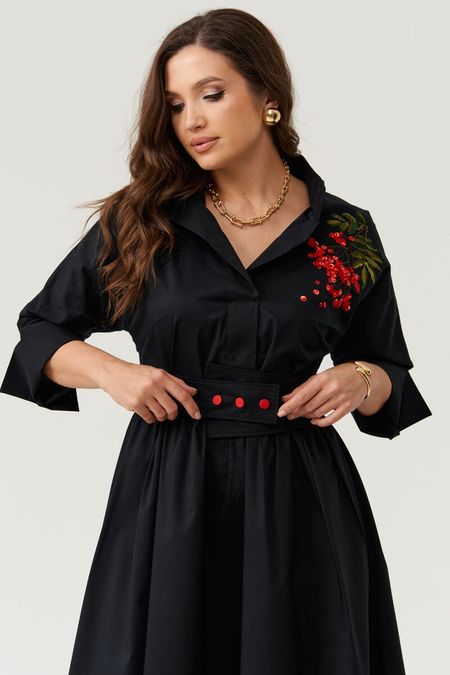 Платье женское из хлопковой ткани для повседневной носки. Без подкладки. Платье полуприлегающего силуэта. Платье отрезное по линии талии и имеет небольшую сборку. Перед имеет две нагрудные вытачки, а также дизайнерскую вышивку в виде веточки рябины. В боковых швах располагаются прорезные карманы. Горловина обработана втачной планкой с нахлестом в V-образной горловине, а также воротником-стойкой. Рукава втачные, длиной. ниже локтя. Низ рукава обработан отлетной манжетой. Юбка платья расширенная. Платье укомплектовано поясом из основной ткани изделия. Пояс со вставкой на резинке, застежка на кнопки. Длина изделия миди. Данное платье черного оттенка станет незаменимой вещью в вашем гардеробе, оно отлично будет сидеть и смотреться на любой фигуре.<br> <br> Параметры изделия:<br><b>Размер 48164</b><br>Платье: Дл.спины от высшей плечевой точки до подреза — 43см, Длина изделия — 119.5см, Длина рукава — 54см, Длина рукава с плечом — 63см, Ширина по бедрам — 84см, Ширина по груди — 53.5см, Ширина по подрезу — 51см, Ширина рукава — 225.5см;<br/><b>Размер 50164</b><br>Платье: Дл.спины от высшей плечевой точки до подреза — 43см, Длина изделия — 119.5см, Длина рукава — 54см, Длина рукава с плечом — 63см, Ширина по бедрам — 86см, Ширина по груди — 55.5см, Ширина по подрезу — 53см, Ширина рукава — 23.2см;<br/><b>Размер 52164</b><br>Платье: Дл.спины от высшей плечевой точки до подреза — 43.5см, Длина изделия — 120см, Длина рукава — 54см, Длина рукава с плечом — 63см, Ширина по бедрам — 88см, Ширина по груди — 57.5см, Ширина по подрезу — 55см, Ширина рукава — 24см;<br/><b>Размер 54164</b><br>Платье: Дл.спины от высшей плечевой точки до подреза — 43.5см, Длина изделия — 120см, Длина рукава — 54см, Длина рукава с плечом — 63см, Ширина по бедрам — 90см, Ширина по груди — 59.5см, Ширина по подрезу — 57см, Ширина рукава — 24.7см;<br/>