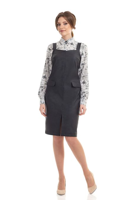 Сарафан на широких бретелях полуприлегающего силуэта выполненный из экокожи. На полочке декоративные клапаны. Потайная молния в боковом шве. По переду разрез.