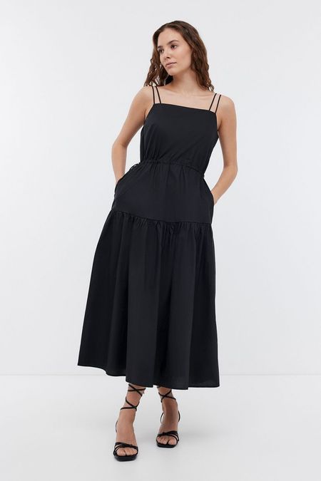 Сарафан на тонких двойных бретелях красиво выглядит в повседневных луках для офиса и прогулок. Его уместно интегрировать в многослойные кэжуал и деловые аутфиты. Вне зависимости от повода надеть обладательница будет ощущать удобство. Продуманный крой обеспечивает свободу движений. Однотонная модель длины миди обладает утяжкой по талии, которая делает силуэт более женственным. Акцент на изгибах фигуры придает утонченность. Воздушная удлиненная юбка имеет ярусную конструкцию. В боковых швах предусмотрены вместительные карманы для ценных мелочей. Изделие выполнено из хлопкового поплина с безупречно гладкой фактурой. Хлопок отличается дышащими свойствами и мягкостью. Он не требует специального ухода и устойчив к деформации.
