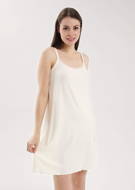 Ночная сорочка из вискозного трикотажного полотна — кашкорсе лапша. Модель А-образного силуэта дополнена узкими бретелями. Спереди по горловине кружево, по спинке окантовка. По низу изделия узкий оверлок. Материал из вискозы обладает хорошей воздухопроницаемостью, приятен на ощупь и комфортен для тела в носке. Добавление эластана обеспечивает сохранение формы и яркости цвета изделия даже после множества стирок. Мягкая, удобная сорочка прекрасно подходит для отдыха и сна. Рекомендуемая температура стирки в деликатном режиме — до 30 градусов, температура утюжки — до 110 градусов.