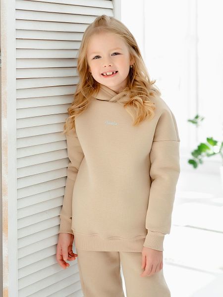 Стильная утепленная толстовка из футера с начесом бежевого цвета для девочки свободного силуэта с длинными рукавами и капюшоном. Спущенное плечо, рукава на манжетах. Низ толстовки — с притачным поясом, что позволяет сохранять тепло. Изделие выполнено из трикотажа премиального качества — ПЕНЬЕ, с содержанием хлопка более 80%