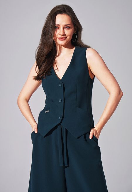 Классическая женская жилетка — стильный и яркий аксессуар, который придаст элегантности любому образу. Она подходит как для повседневных рабочих будней, так и для особых случаев, включая праздники и вечеринки. Жилетка выполнена из костюмной ткани высокого качества, что делает ее приятной на ощупь, а внутренняя подкладка из вискозы с полиэстером обеспечивает комфорт и удобство при ношении. Полуприталенный крой изделия мягко скрывает недостатки фигуры и подчеркивает достоинства. Карманы листочки, фигурный низ и пуговицы создают строгую и деловую атмосферу, в то время как хлястик на спине добавляет романтический акцент и позволяет подстроить размер именно под себя. Благодаря этому короткая жилетка не сковывает движения и подходит как для полных, так и для стройных женщин. Укороченный жилет полуприлегающего силуэта имеет однотонную расцветку, что делает его универсальной вещью для комбинирования. Его можно носить на голое тело, а также сочетать с другими элементами верхней одежды, что особенно важно для учителей и студентов, а также для работников офиса. Удобный и легкий офисный жилет для девушек — это прекрасный вариант для работы или просто прогулки по улицам города.
