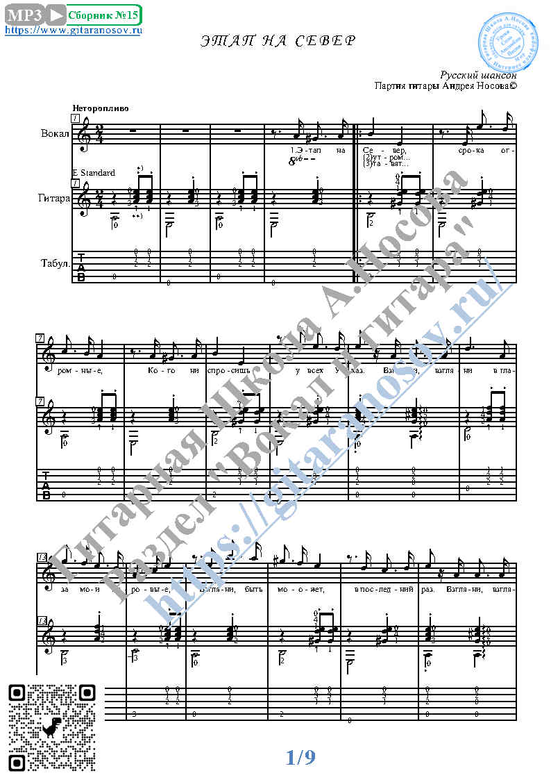 Вашему вниманию предлагается композиция "Этап на Север (Русский шансон)", предназначенная для вокала в сопровождении 6-ти струнной гитары. Запись выполнена нотами и включает в себя партию вокала с подтекстовкой, партию гитары с подробнейшей аппликатурой и текст песни (НА РУССКОМ).