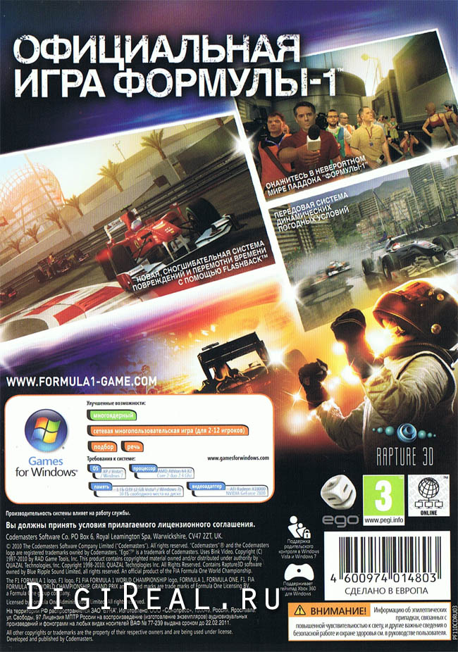 Новый движок от Codemasters "EGO Game Technology" подарит вам потрясающие визуальные спецэффекты, динамическую смену погоды и абсолютно невероятно реалистичную модель повреждения. Все это можно будет ощутить не только в одиночной игре, но и в соревнованиях с друзьями по мультиплееру.