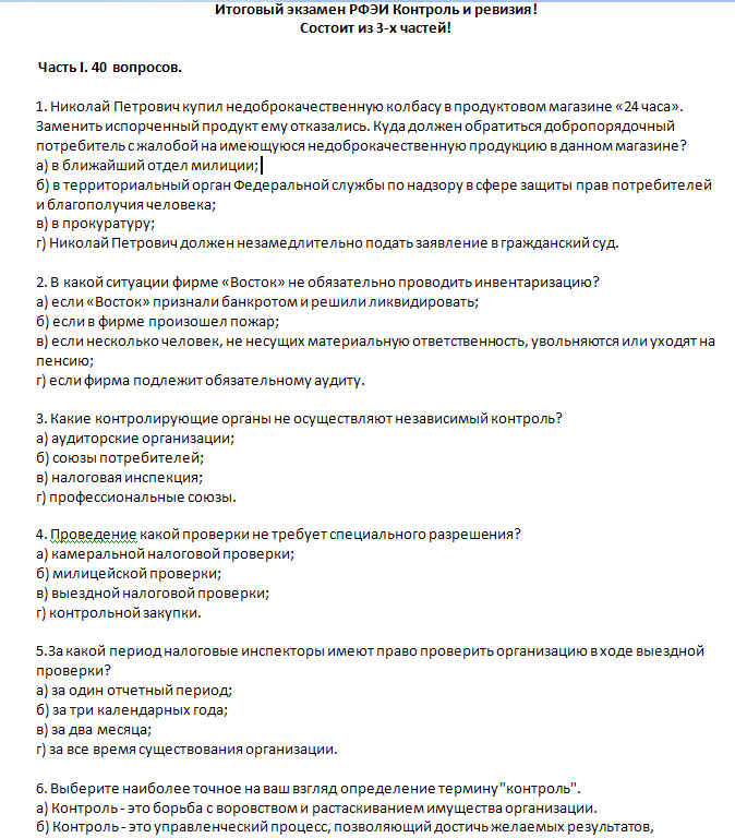 Итоговый экзамен "Контроль и ревизия". Региональный финансово - экономический институт.