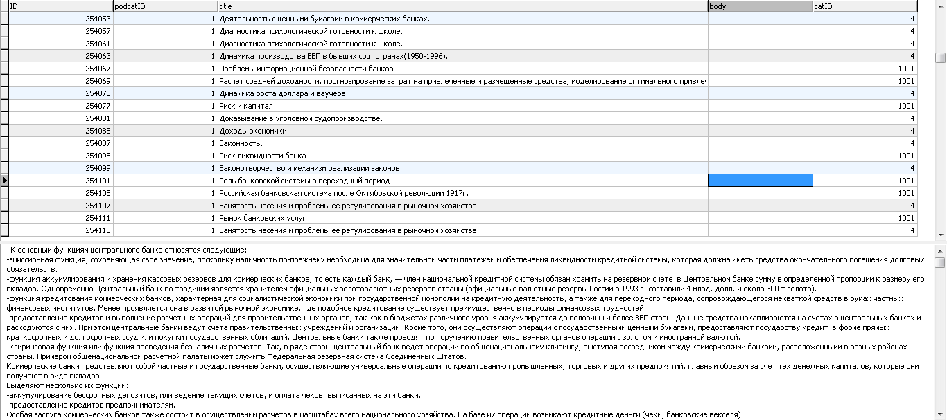 База данных рефератов состоит из 17072 рефератов, разделённых на 119 категорий. Размер базы данных с текстами рефератов 564 мб. (Рефераты в базе в двух форматах, один с тегами форматирования, другой без, так что реально их в 2 раза меньше). Текст в базе в кодировке cp-1251. Вы также можете заказать изменение структуры базы под движок своего сайта.
