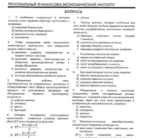 Итоговый экзамен "ЭКОНОМИКА ОРГАНИЗАЦИЙ". Региональный финансово - экономический институт.