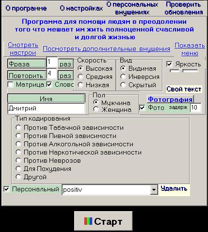 Цветовые вспышки и музыка программы действуют как гипнотический элемент. Которые помогают словам внушения дойти до подсознания минуя "внутреннего критика"