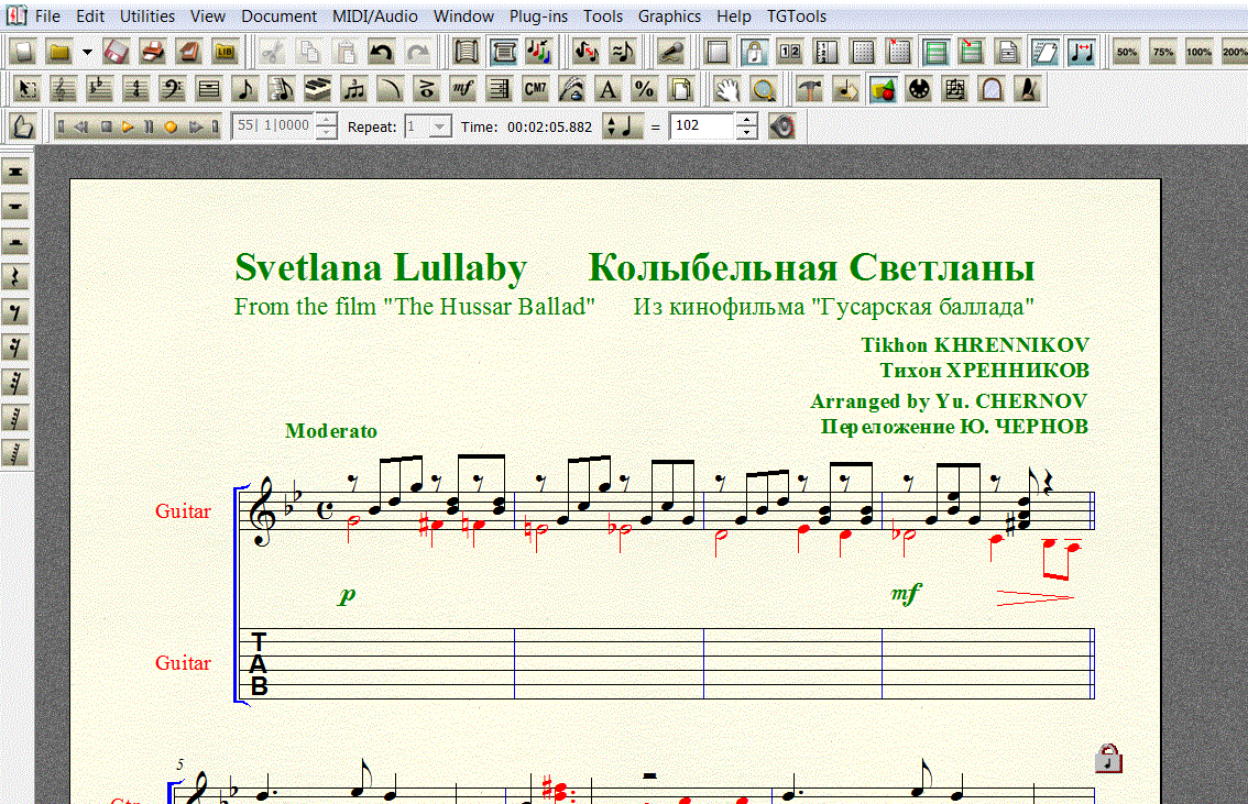 1 Khrennikov SVETLANA LULLABY (1) – переложение Ю. Чернова (исходная тональность g-moll); под нотной строкой добавлена таблатурная строка, что бы вы сами могли создать и редактировать собственную «распальцовку».
