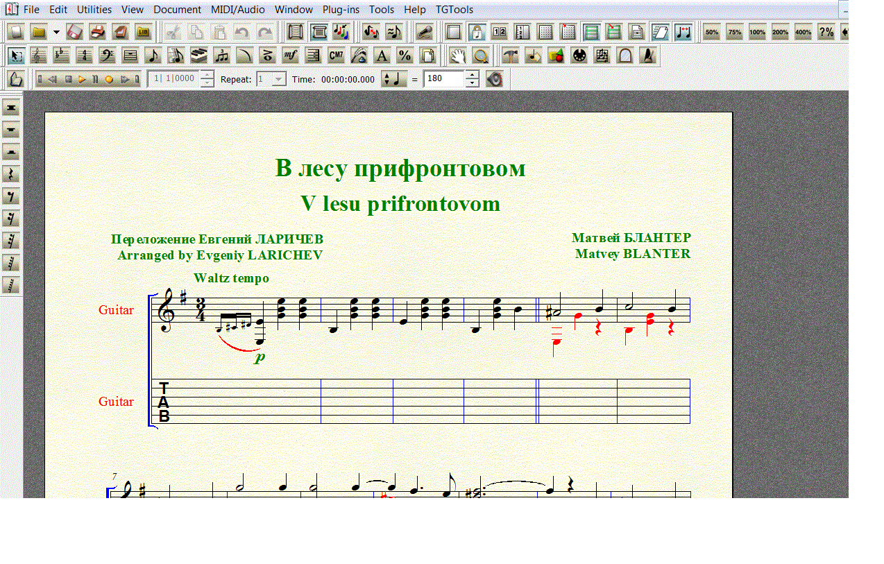 Переложение песни Матвея Блантера В ЛЕСУ ПРИФРОНТОВОМ для 6-й гитары. Нотный набор выполнен в FINALE 2008 (расширение .mus). Под нотной строкой добавлена таблатурная строка, что бы вы сами могли создать и редактировать собственную «распальцовку».