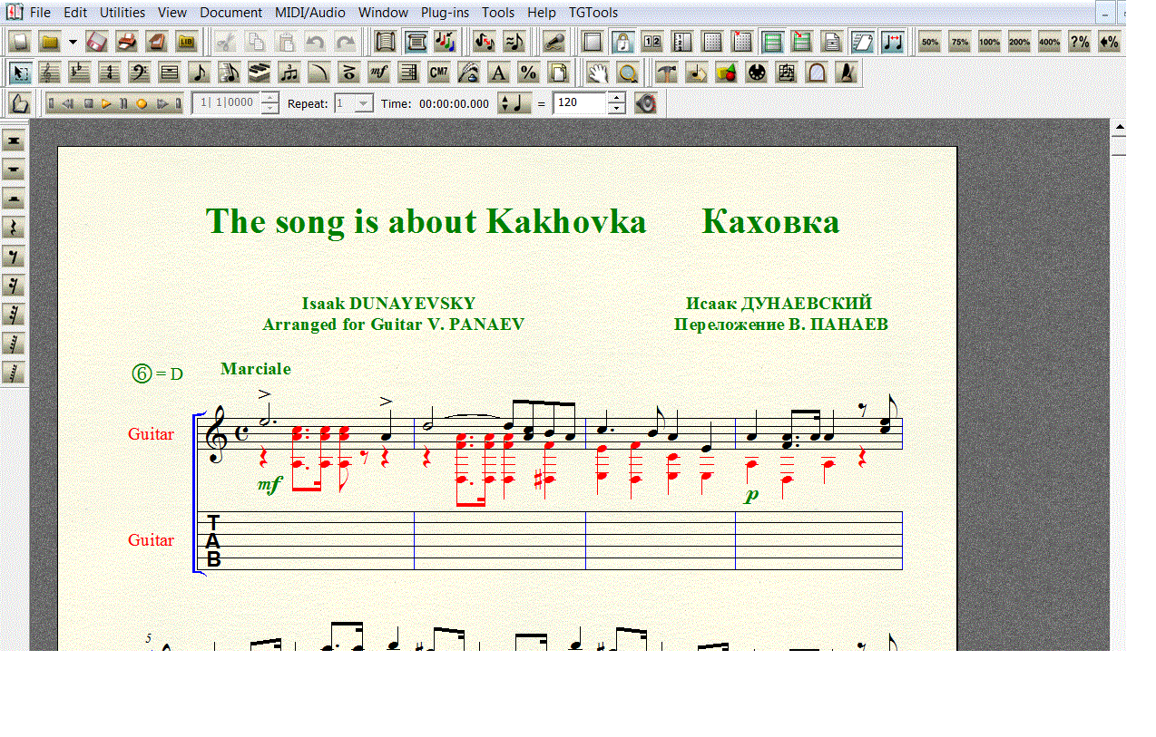 Переложение песни Исаака Дунаевского ПЕСНЯ О КАХОВКЕ для 6-й гитары в формате FINALE 2008 (расширение .mus). Под нотной строкой добавлена таблатурная строка, что бы вы сами могли создать и редактировать собственную «распальцовку».