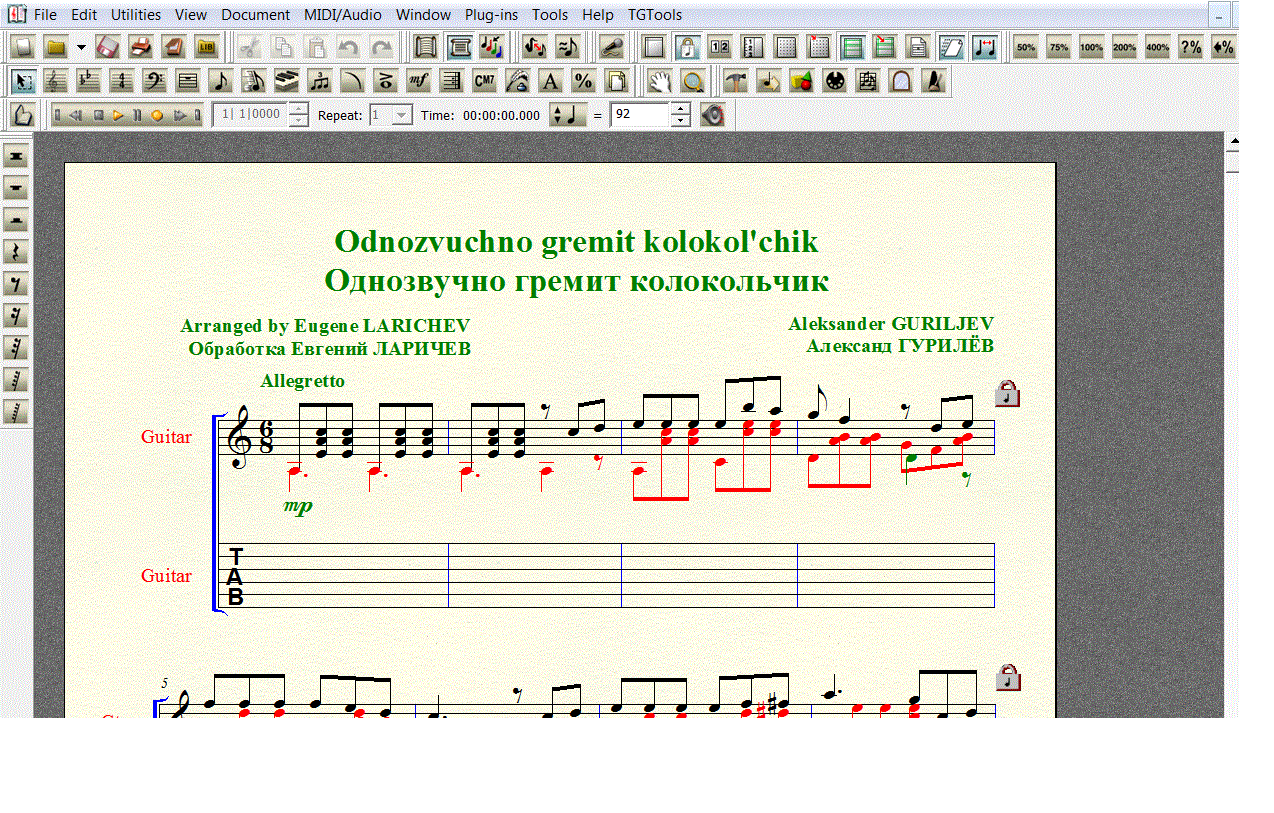Переложение песни Александра Гурилева ОДНОЗВУЧНО ГРЕМИТ КОЛОКОЛЬЧИК для 6-й гитары. Нотный набор выполнен в FINALE 2008 (расширение .mus). Под нотной строкой добавлена таблатурная строка, что бы вы сами могли создать и редактировать собственную «распальцовку».