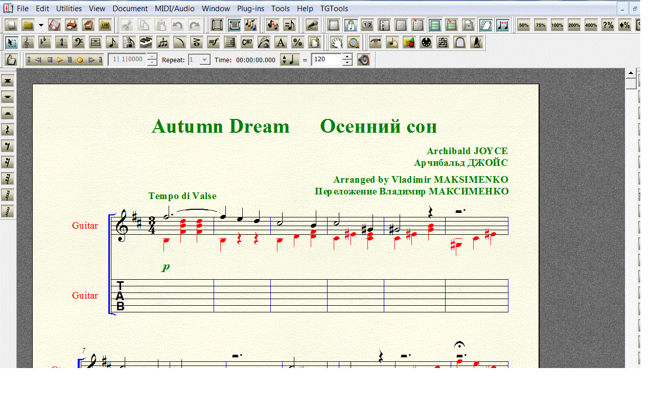 Переложение старинного валься Арчибальда Джойса ОСЕННИЙ СОН для 6-й гитары. Нотный набор выполнен в FINALE 2008 (расширение .mus). Под нотной строкой добавлена таблатурная строка, что бы вы сами могли создать и редактировать собственную «распальцовку».