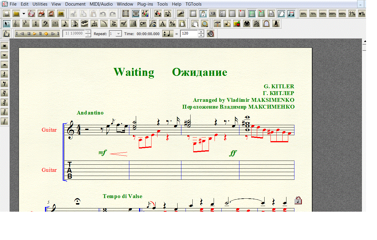 Переложение старинного вальса Г. Китлера ОЖИДАНИЕ для 6-й гитары в формате FINALE 2008 (расширение .mus). Под нотной строкой добавлена таблатурная строка, что бы вы сами могли создать и редактировать собственную «распальцовку».