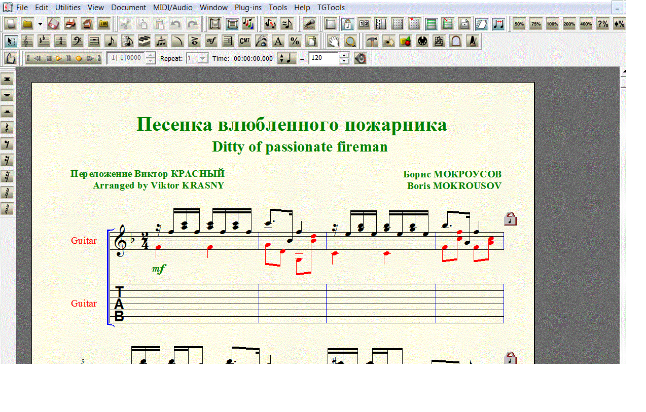 "Ты ласточка моя, ты зорька ясная, ты, в общем, самая огнеопасная..." Переложение песни Бориса Мокроусова ПЕСЕНКА ВЛЮБЛЕННОГО ПОЖАРНИКА для 7-й гитары в формате FINALE 2008 (расширение .mus). Под нотной строкой добавлена таблатурная строка, что бы вы сами могли создать и редактировать собственную «распальцовку».