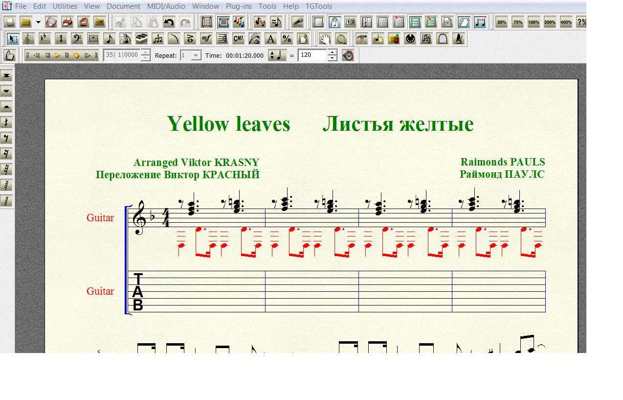 Переложение песни Раймонда Паулса ЛИСТЬЯ ЖЕЛТЫЕ для 7-й гитары в формате FINALE 2008 (расширение .mus). Под нотной строкой добавлена таблатурная строка, что бы вы сами могли создать и редактировать собственную «распальцовку».