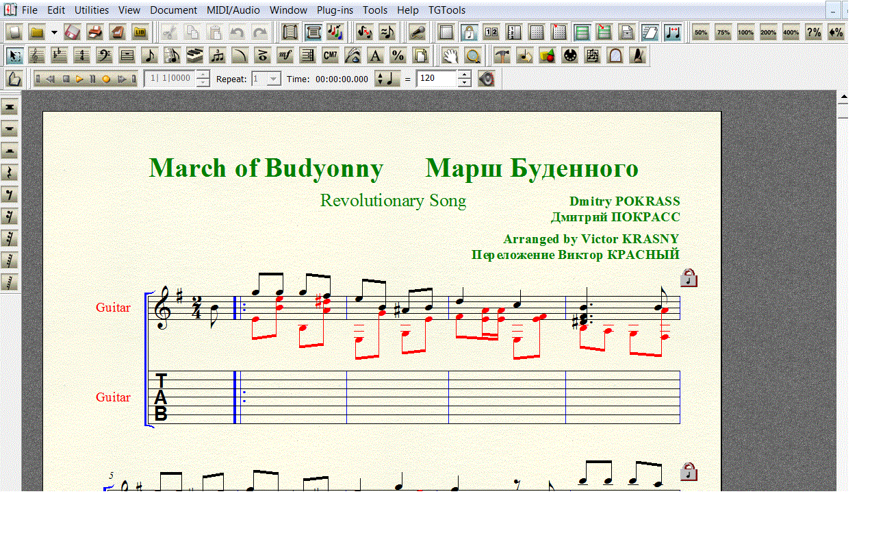 "Мы - красные кавалеристы, и про нас былинники речистые ведут рассказ..." Переложение песни Дмитрия Покрасса МАРШ БУДЕННОГО для 7-й гитары в формате FINALE 2008 (расширение .mus). Под нотной строкой добавлена таблатурная строка, что бы вы сами могли создать и редактировать собственную «распальцовку».