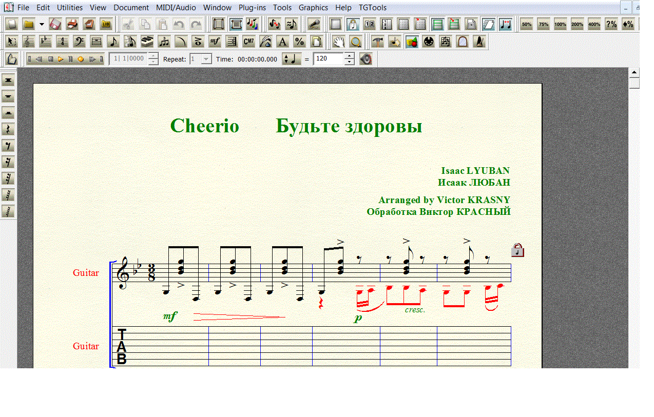 "Так будьте здоровы! Живите богато! А мы уезжаем до дому, до хаты!" Переложение песни Исаака Любана БУДЬТЕ ЗДОРОВЫ для 7-й гитары в формате FINALE 2008 (расширение .mus). Под нотной строкой добавлена таблатурная строка, что бы вы сами могли создать и редактировать собственную «распальцовку».