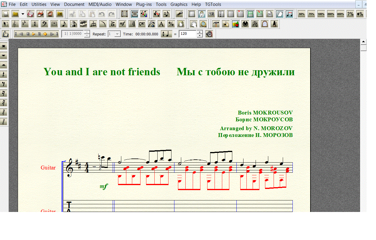 "Мы с тобою не дружили, не встречались по весне, но глаза твои большие не дают покоя мне..." Переложение песни Бориса Мокроусова МЫ С ТОБОЮ НЕ ДРУЖИЛИ для 7-й гитары в формате FINALE 2008 (расширение .mus). Под нотной строкой добавлена таблатурная строка, что бы вы сами могли создать и редактировать собственную «распальцовку».