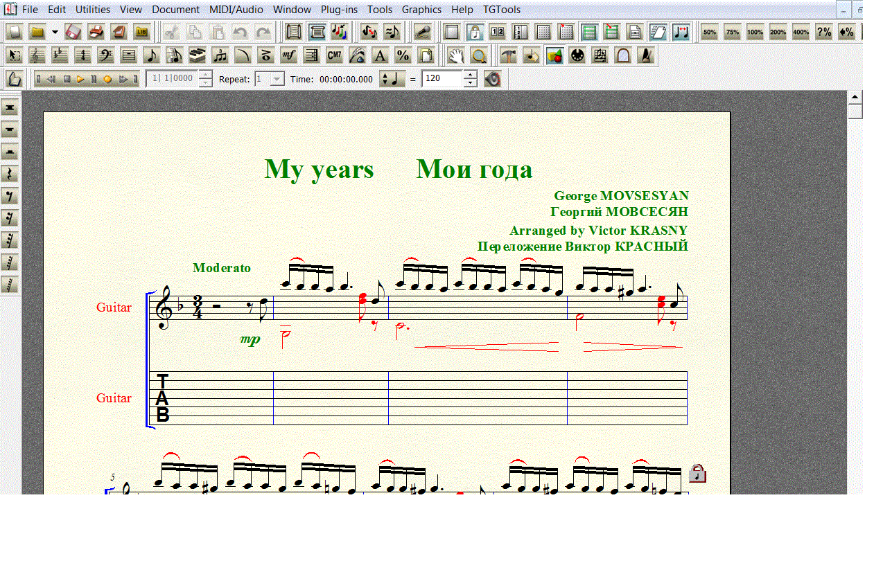 "Мои года - мое богатство..." Переложение песни Георгия Мовсесяна МОИ ГОДА для 7-й гитары в формате FINALE 2008 (расширение .mus). Под нотной строкой добавлена таблатурная строка, что бы вы сами могли создать и редактировать собственную «распальцовку».