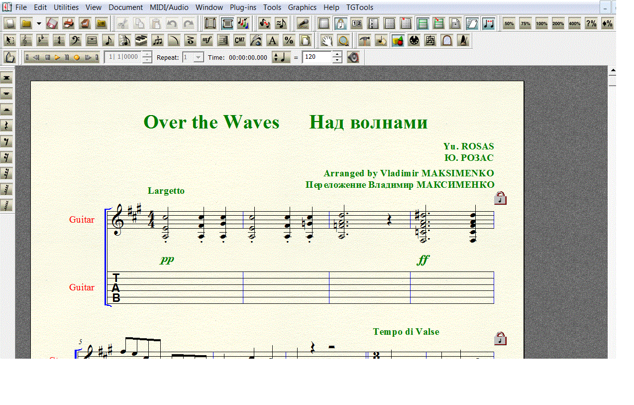 Переложение старинного вальса Ю. Розаса НАД ВОЛНАМИ для 6-й гитары в формате FINALE 2008 (расширение .mus). Под нотной строкой добавлена таблатурная строка, что бы вы сами могли создать и редактировать собственную «распальцовку».