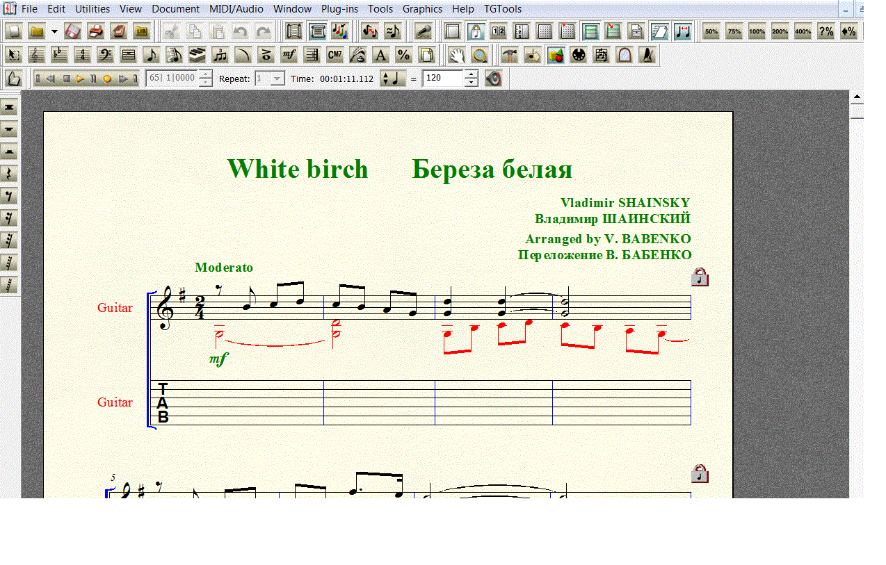 Переложение песни Владимира Шаинского БЕРЕЗА, БЕЛАЯ ПОДРУГА для 6-й гитары в формате FINALE 2008 (расширение .mus). Под нотной строкой добавлена таблатурная строка, что бы вы сами могли создать и редактировать собственную «распальцовку».
