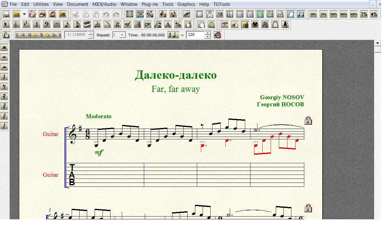 "Далеко-далеко, где кочуют туманы..." Переложение песни Георгия Носова ДАЛЕКО-ДАЛЕКО для 7-й гитары в формате FINALE 2008 (расширение .mus). Под нотной строкой добавлена таблатурная строка, что бы вы сами могли создать и редактировать собственную «распальцовку».