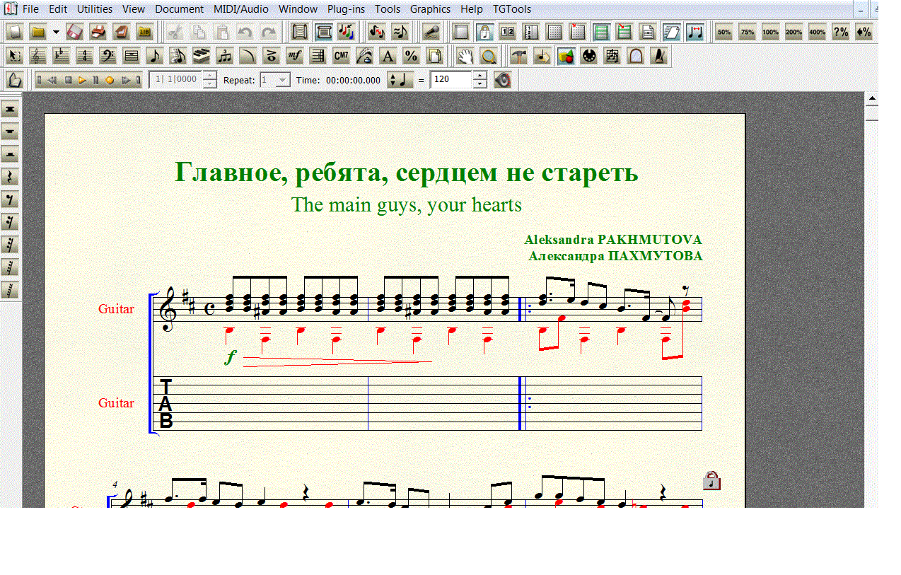 "Под крылом самолета о чем-то поет..." Переложение песни Александры Пахмутовой ГЛАВНОЕ, РЕБЯТА, СЕРДЦЕМ НЕ СТАРЕТЬ! для 7-й гитары в формате FINALE 2008 (расширение .mus). Под нотной строкой добавлена таблатурная строка, что бы вы сами могли создать и редактировать собственную «распальцовку».