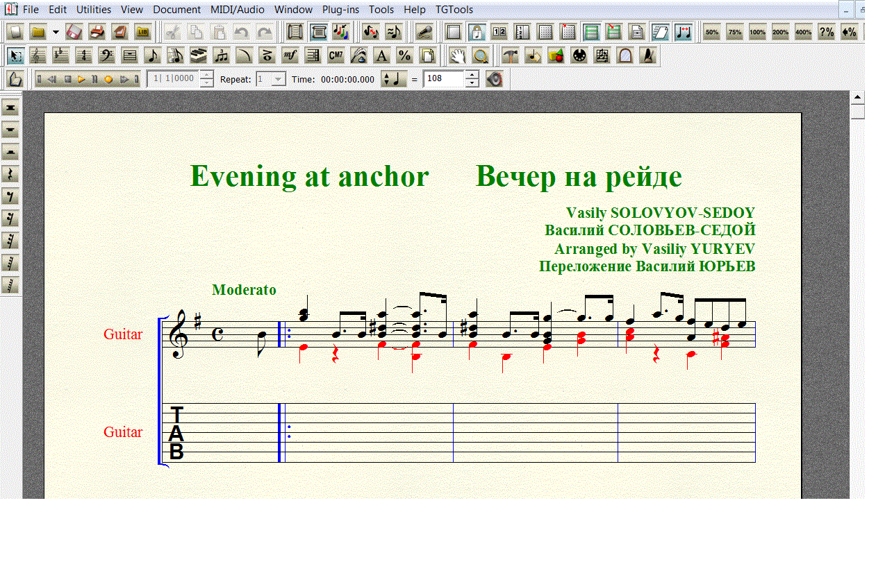 "Прощай, любимый город, уходим завтра в море..." Переложение песни Василия Соловьева-Седого ВЕЧЕР НА РЕЙДЕ для 7-й гитары в формате FINALE 2008 (расширение .mus). Под нотной строкой добавлена таблатурная строка, что бы вы сами могли создать и редактировать собственную «распальцовку».