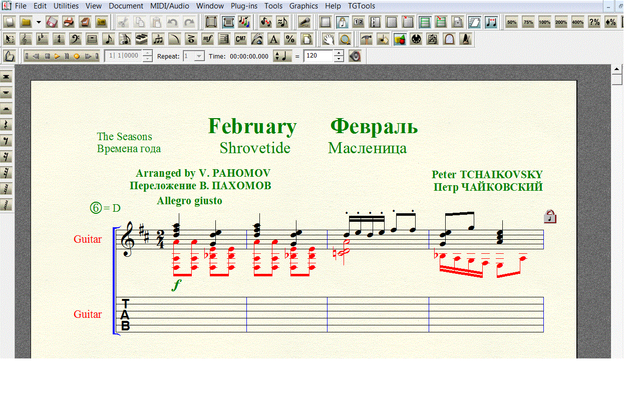 Петр Чайковский "Времена года" ФЕВРАЛЬ (МАСЛЕНИЦА). Переложение для 6-й гитары в формате FINALE 2008 (расширение .mus). Под нотной строкой добавлена таблатурная строка, что бы вы сами могли создать и редактировать собственную «распальцовку».