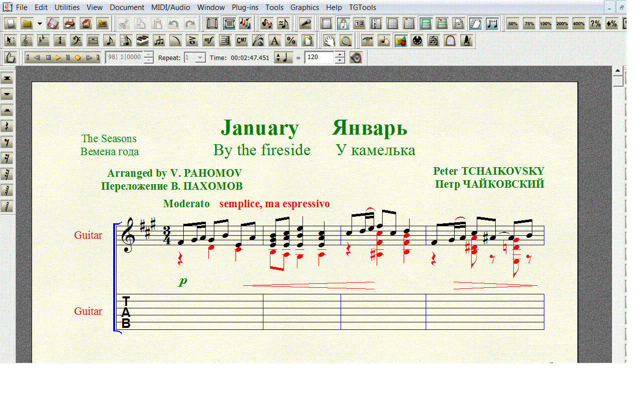 Петр Чайковский "Времена года" ЯНВАРЬ (У КАМЕЛЬКА). Переложение для 6-й гитары в формате FINALE 2008 (расширение .mus). Под нотной строкой добавлена таблатурная строка, что бы вы сами могли создать и редактировать собственную «распальцовку».