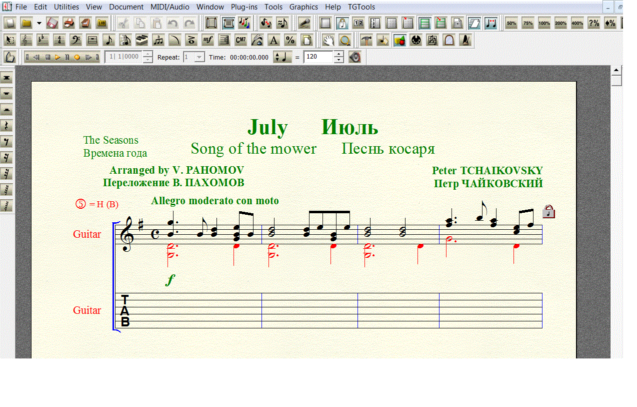 Петр Чайковский "Времена года" ИЮЛЬ (ПЕСНЬ КОСАРЯ). Переложение для 6-й гитары в формате FINALE 2008 (расширение .mus). Под нотной строкой добавлена таблатурная строка, что бы вы сами могли создать и редактировать собственную «распальцовку».