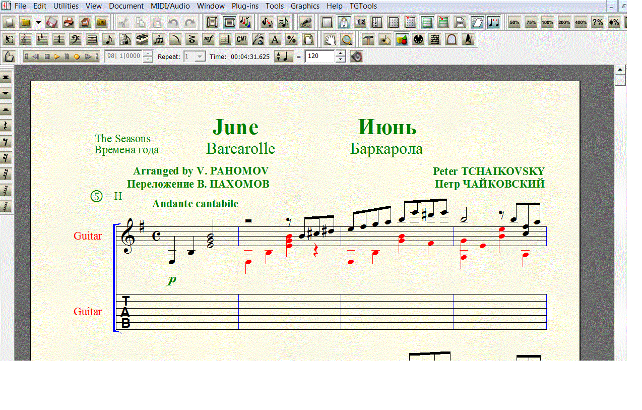 Петр Чайковский "Времена года" ИЮНЬ (БАРКАРОЛА). Переложение для 6-й гитары в формате FINALE 2008 (расширение .mus). Под нотной строкой добавлена таблатурная строка, что бы вы сами могли создать и редактировать собственную «распальцовку».