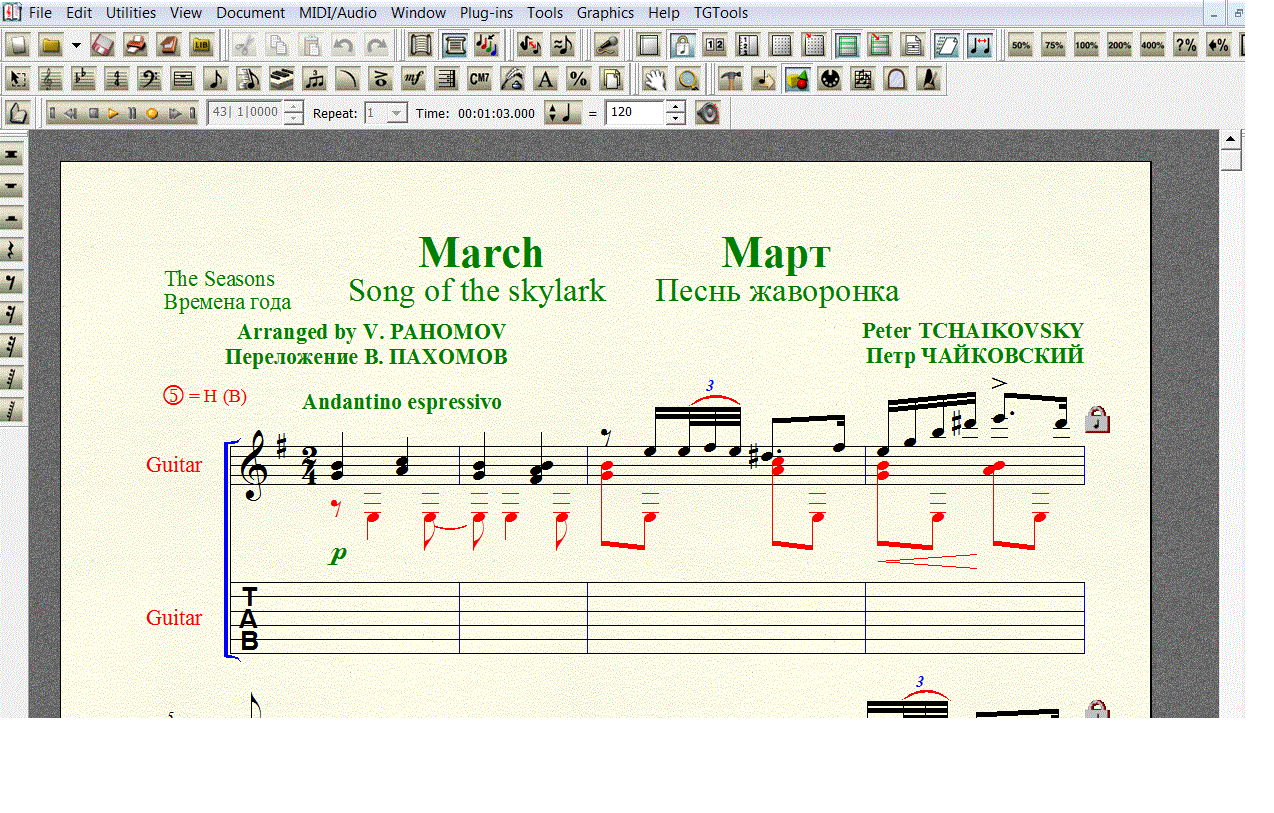 Петр Чайковский "Времена года" МАРТ (ПЕСНЬ ЖАВОРОНКА). Переложение для 6-й гитары в формате FINALE 2008 (расширение .mus). Под нотной строкой добавлена таблатурная строка, что бы вы сами могли создать и редактировать собственную «распальцовку».