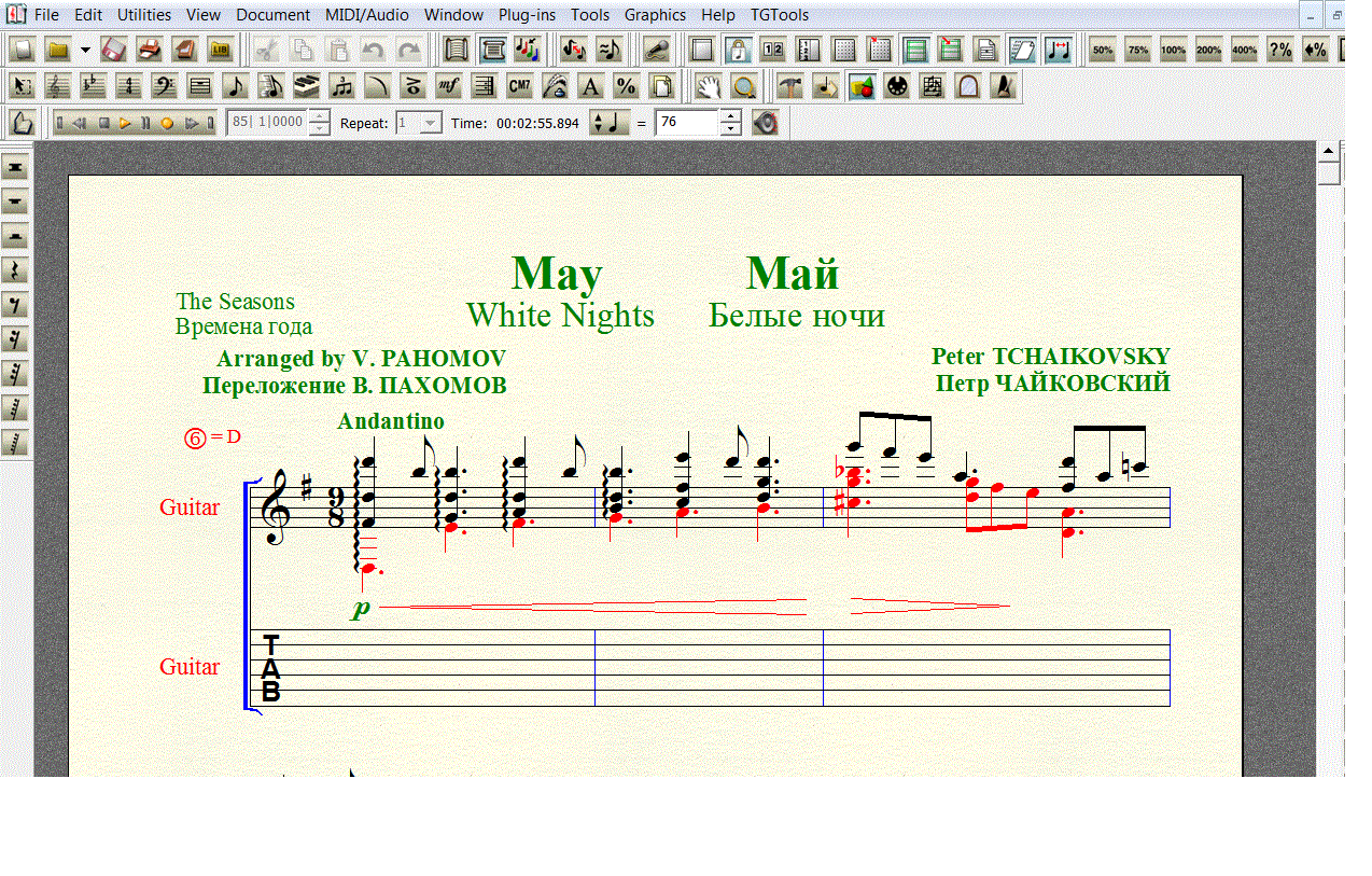 Петр Чайковский "Времена года" МАЙ (БЕЛЫЕ НОЧИ). Переложение для 6-й гитары в формате FINALE 2008 (расширение .mus). Под нотной строкой добавлена таблатурная строка, что бы вы сами могли создать и редактировать собственную «распальцовку».