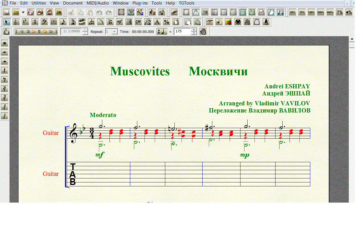"Сережка с Малой Бронной и Витька с Маховой..." Переложение песни Андрея Эшпая МОСКВИЧИ для 7-й гитары в формате FINALE 2008 (расширение .mus). Под нотной строкой добавлена таблатурная строка, что бы вы сами могли создать и редактировать собственную «распальцовку».