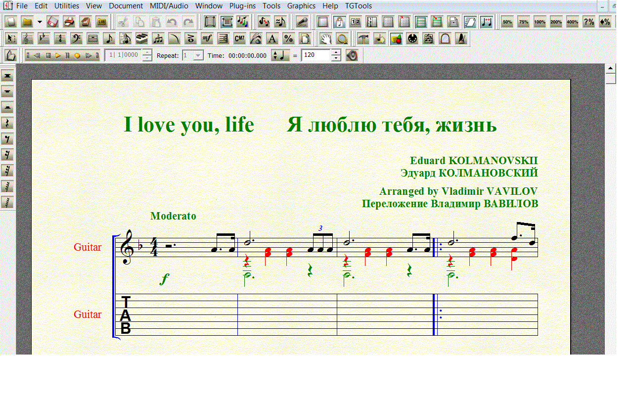 Переложение песни Эдуарда Колмановского Я ЛЮБЛЮ ТЕБЯ, ЖИЗНЬ для 7-й гитары в формате FINALE 2008 (расширение .mus). Под нотной строкой добавлена таблатурная строка, что бы вы сами могли создать и редактировать собственную «распальцовку».