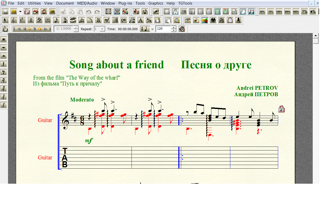 "Если радость на всех одна, на всех и беда одна..." Переложение песни Андрея Петрова из фильма "Путь к причалу" ПЕСНЯ О ДРУГЕ для 7-й гитары в формате FINALE 2008 (расширение .mus). Под нотной строкой добавлена таблатурная строка, что бы вы сами могли создать и редактировать собственную «распальцовку».